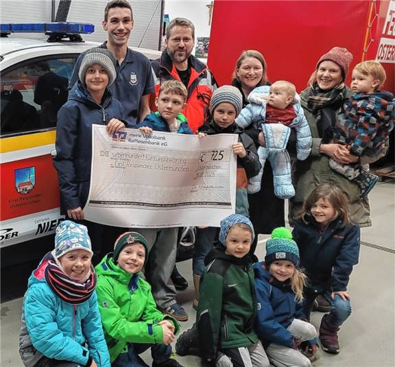 Die Summe von 725 Euro überreichten kürzlich die Klöpferkinder an die First Responder der Feuerwehr Ostermünchen. Christoph Lederer, Leiter der First Responder, freute sich, dass junge Menschen die Wichtigkeit des First Responder erkennen. Vorsitzender Thomas Niedermaier erklärte den Kindern ausführlich, dass die Feuerwehr Pflichtaufgabe der Gemeinde ist, während sich die First Responder, eine freiwillige Aufgabe, nur aus Spenden finanzieren.